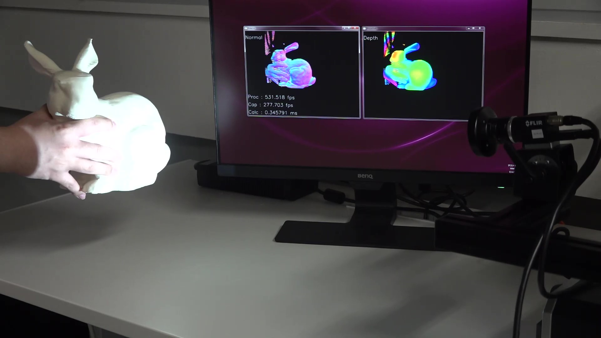 そこで,本研究では高速プロジェクタと偏光アレイカメラを用いて位相シフト法を行い,深度・法線を高速かつ同時に取得する手法を提案する. この手法では,位相シフト法に用いた画像を偏光解析に再利用することで撮像枚数を減らすことができ, また偏光から計算した法線には方位角に180°の曖昧性があり,また天頂角には低周波ノイズが発生しているが,同時に取得した深度を利用することによってこれらの誤差を解消することができる. 実証のため,深度と法線を 280 fps で同時にリアルタイム取得できるシステムを構築し.約 0.25 ms で計算が完了できることを確認した.