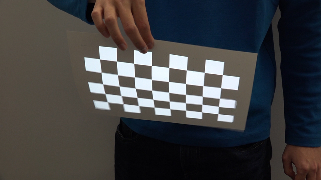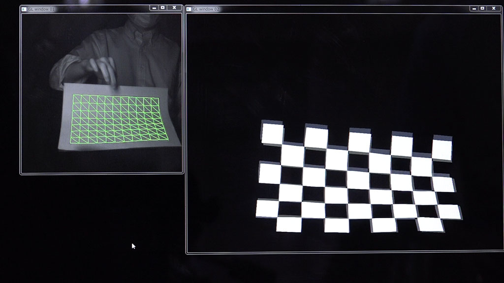 このような背景の下,本研究ではマーカベースの高速な非剛体変形トラッキングを新たに提案している.これは,マーカを対象表面に印字し,カメラによって観測されるマーカの歪みを介して,対象の変形を取得するものである.我々は,新たに提案するマーカをDeformable Dot Cluster Markerと呼んでいる.このマーカは,複雑な変形・運動が生じた場合でも,マーカ内の局所的な位置を他の位置と誤識別しないように最適化されている.また,マーカは白と黒のみで表現されるため,対象に簡単に印字することができる.このようなマーカの設計とともに,変形を取得する画像処理も提案している.これは,マーカを画像内から検出する処理と,高フレームレート撮像に基づいて継続的に追跡する処理を並行実行するものである.これによって,ロバストかつ高速な非剛体変形トラッキングが可能である.また,複数の種類のマーカが画像内に存在しても,個別に認識することが可能である.実装の結果,CPU上の実行で1,000fpsを達成可能であることを実証した.また,本トラッキングによって得られた変形情報を利用して画像を生成し,高速プロジェクタDynaFlashによって投影することで,非剛体曲面へのダイナミックプロジェクションマッピングが1,000fpsで実現できることを示している.