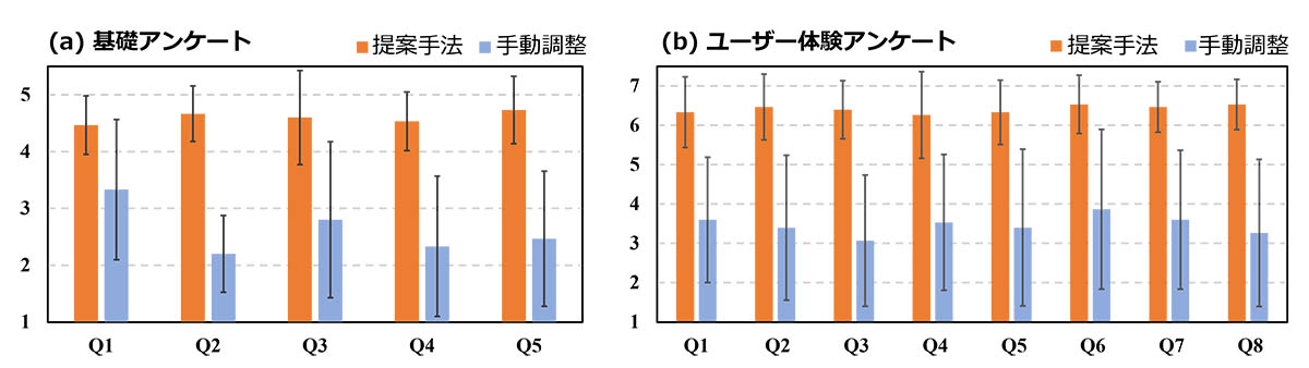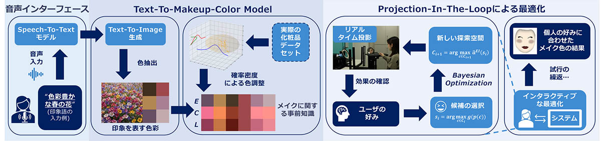 さらに,その候補色によるメイクをダイナミックプロジェクションマッピングによってユーザーの顔に直接投影し,提示された選択肢から好みのものを対話的に選ぶだけで,ユーザーの潜在的な好みの色へと効率的に導く手法を導入しました.ユーザー体験を分析する被験者実験の結果,提案した手法によって,より効率的かつ簡単に好みのメイク色を探索できることが実証されました.本研究の成果は,これまで時間を要していた化粧品選びを,実際にメイクを試す工程を伴いながらも,自由な自己表現と効率的な探索を両立したプロセスへと発展させるものと期待されます.